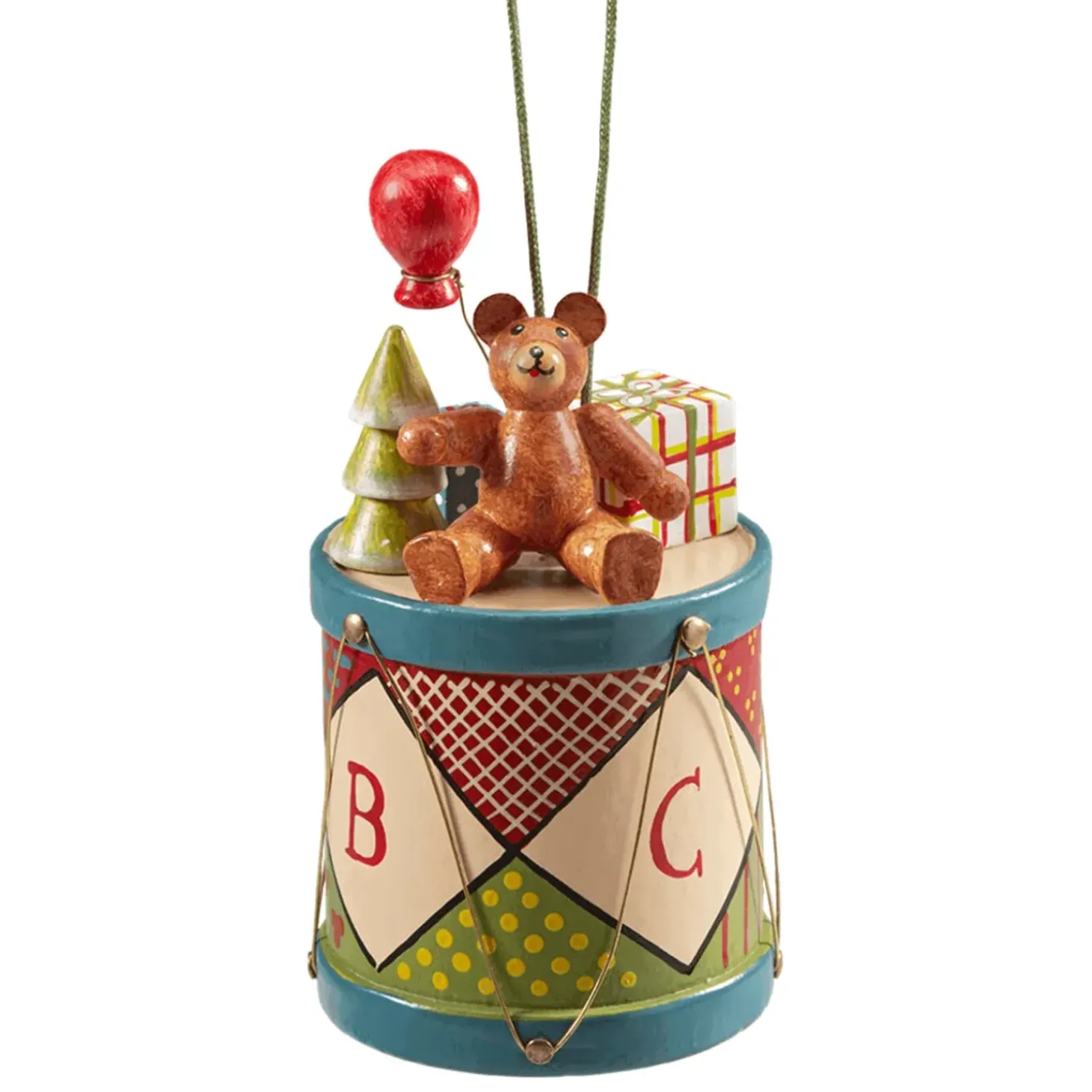 Der Weihnachtsmann Hat Die Geschenke Schon Unter Dem Baum Gelegt! Eine Wunderschone Bunte Trommel, Ein Knuddeliger Teddybar Mit Einem Schwebenden Roten Luftballon Und Noch Einiges Mehr. Die Liebevolle Gestaltung Und Bemalung In Warmen Farben Machen Das Ornament Zu Einem Besonderen Weihnachtsgeschenk Und Einer Zeitlosen Dekoration!