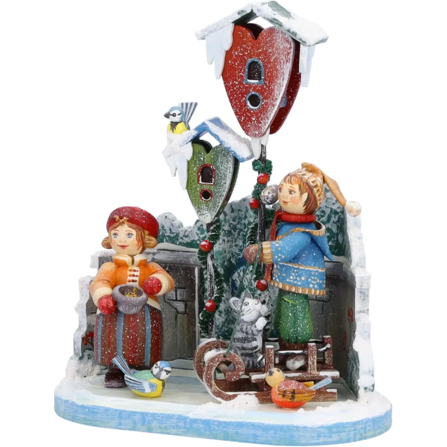 Abseits Des Weihnachtlichen Treibens Im Dorf Freuen Sich Die Vogel Uber Den Besuch Der Kinder. Begleitet Werden Sie Von Einem Grauen Katzchen Welches Auf Dem Schlitten Des Jungen Sitzt. Aufgeregt Und Neugierig Flattern Die Vogel Aus Ihrem Vogelhaus Und Freuen Sich Uber Das Mitgebrachte Futter. Das Kleine Madchen Verteilt Die Korner Aus Der Ihrer Futterschale Mit Einem Lacheln Im Gesicht. Eine Bezaubernde Szenerie In Ihrer Winterwelt!