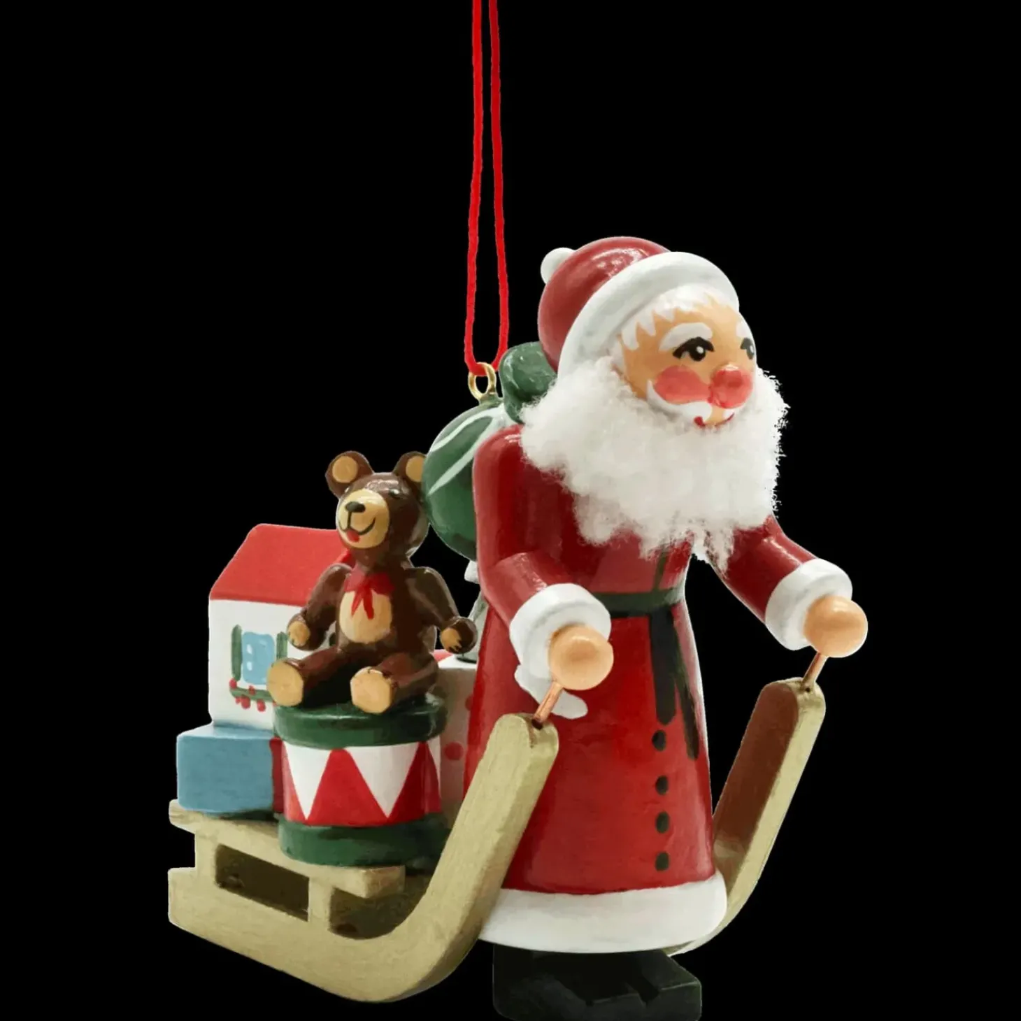 Endlich Ist Es Soweit! An Heiligabend Tritt Der Weihnachtsmann Den Weiten Weg An, Um Gros Und Klein Mit Geschenken Eine Freude Zu Bereiten. Beherzt Stapft Der Weihnachtsmann Mit Rauschebart Und Geschenkesack Durch Den Winterwald Und Zieht Den Mit Geschenken Bepackten Schlitten Hinter Sich Her. Geschenkepackchen, Eine Trommel Und Ein Bar Sind Zu Sehen. Wer Diese Wohl Bekommen Wird? Die Muntere Gestaltung Und Bemalung Machen Das Ornament Zu Einem Schonen Begleiter Durch Die Adventszeit!